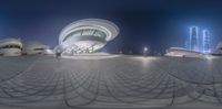 A modern, futuristic architecture in a bustling cityscape. The building's curved curves stand out against the clear sky and artificial light. The open space plaza is the perfect spot for day and night activities, including concerts and museum visits.