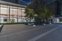 A modern glass building surrounded by lush vegetation and trees, creating a harmonious blend of nature and urban design. The vibrant nighttime city lights illuminate the business district, showcasing the bustling city life.