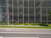 A modern high-rise building surrounded by an urban landscape in Germany. Grey road surfaces and parking decks contrast with vibrant green grass and vegetation. The city comes alive with the mesh of urban design and modern architecture.