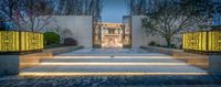 a modern home with some steps leading to it's entrance at night time on a cobblestone sidewalk and lawn area