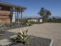 two green agave plants and some rocks outside a house, with a sky background
