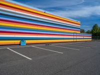an empty parking lot painted brightly stripes on the wall of the building and sky as well as stones