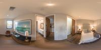 a fish eye view of a bedroom with white bed and artwork on the wall, and a large picture of a house by the door