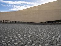 A stunning example of modern architecture in Lisbon, Portugal. The building features a facade composed of composite materials and has a sleek rectangular shape. The cobblestone road in front adds a touch of charm to the scene. The open space surrounding the building allows for plenty of natural light, as can be seen in the photo taken during the day. The black road surface adds contrast and symmetry to the composition. The cloudy sky provides a backdrop of tints and shades, creating a visually appealing image of contemporary architecture in Europe.