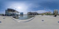 a fish eye view of a pond surrounded by buildings and some water steps and a bridge