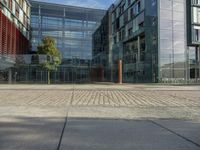 Modern office building with sleek lines and reflective windows in Berlin. The clear sky highlights the building's facade against the cobblestone street. A glimpse into the heart of Germany's bustling business district.