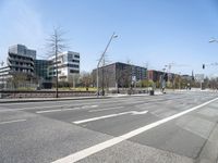 A modern office building in Hamburg, Germany. Clear sky illuminates the sleek architecture. City life thrives amidst the urban design of the business district. Trees line the streets, adding a touch of nature to the bustling city.