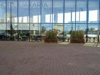 a large building with several potted trees outside the windows of it next to a couple of benches