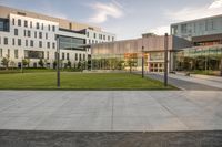 This stock photo showcases a modern office building located in the bustling business district of Toronto, Canada. The building features a sleek facade with large windows, allowing plenty of natural light to shine through. The surrounding area is an open space with well-maintained grass, trees, and vegetation, creating a pleasant and inviting atmosphere. The concrete road surface and asphalt road leading to the building add to the urban design of the property. The image captures a beautiful day with clouds in the sky, casting shadows that add depth to the scene. This photo is perfect for any project related to architecture, city life, urban design, or the business world.