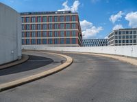 Urban architecture in Berlin, Germany. Modern office buildings and parking garages characterize the business district. Clouds dot the European sky on a typical day. Curved roads and asphalt weave through the city's urban design.
