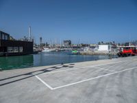 A modern, concrete pier in Barcelona, Spain. The coastal city's iconic architecture and clear sky create a stunning waterfront view. The jetty extends into the calm ocean, providing a landing spot for urban and coastal activities.