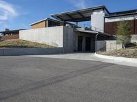 Modern residential architecture in California, USA. The sleek lines of the house facade stand out against the rural landscape. A concrete road leads to the entryway of the property, surrounded by suburban warehouses and wineries. A perfect day to explore the real estate in this suburban area.