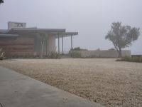 This stock photo features a modern residential home located in Los Angeles, California, USA. The house is made of concrete and has a grey roof. The property is surrounded by a beautifully landscaped garden with grass, trees, and pebble paths. It is situated in a suburban area with a foggy atmosphere and a gloomy grey sky. The residential area offers a peaceful and serene environment, perfect for those seeking a tranquil retreat. The photo captures the essence of modern architecture and real estate in Los Angeles.