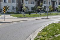 Modern residential architecture in Toronto, Canada. Clean facade with large windows in a vibrant neighborhood. Well-maintained public spaces with urban design. Clear skies showcase the flag waving atop a street light pole.