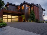 This stock photo features a modern residential building in undefined. The architecture showcases a sleek and contemporary design, with a combination of asphalt road surface and surrounding vegetation, including trees for natural shade. The grey sky creates a gloomy atmosphere, which adds a unique touch to the image. The photo also captures the facade of the villa, highlighting its modern fixtures. Ideal for illustrating concepts related to modern architecture, residential areas, or real estate.