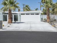 A stunning example of modern architecture in California, USA. This residential building features a sleek design with straight lines and clean surfaces. The spacious home, located in a peaceful residential area, offers a serene and comfortable living environment. With a clear sky above, palm trees line the driveway leading to the garage door and entry gate. The Sonora Desert provides a beautiful backdrop for this mid-century villa in Palm Springs.