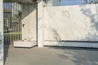 A modern residential building with a sleek facade and concrete surface. The building stands tall in the city, surrounded by urban design and city life. A black skateboarder finds shade under an umbrella while next to a big white fence.