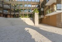 concrete and brick patio at the edge of a building with palm trees behind it and stairs leading to the second floor