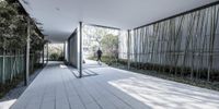 an empty walkway leads to a building with an indoor garden inside and outside on the wall