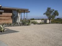 This modern residential home, located in Los Angeles, California, USA, features concrete driveways and gravel patios, providing ample space for plants, bushes, and trees. The property showcases a stylish combination of contemporary architecture and natural elements. The concrete driveways and gravel patios create a visually appealing landscape, while the lush grass, trees, and shrubs add a touch of nature. The house is situated in a suburban area, surrounded by a clear sky and scenic views. The rugged road surface adds to the charm of the property, creating a perfect setting for a peaceful and idyllic lifestyle.