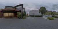 A modern residential house with a circular driveway and paved walkways. The house features a sleek facade and large windows. The surrounding landscape includes green grass, trees, and open spaces. This is a perfect example of contemporary architecture in a residential area.