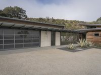 A gloomy dawn in the suburbs of Los Angeles, California. Modern architectural design of a residential house with a composite material roof. The house is surrounded by a vineyard and gravel road.