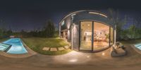 A modern residential property at night, featuring a small round building with glass doors. The swimming pool in the middle creates a beautiful reflection under the clear night sky. The grass surface and artificial lights enhance the overall ambiance.