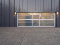 A modern residential villa in California at dawn. The house features a stylish rectangular shape, composite flooring, and large windows. The driveway is made of concrete and leads to a shaded entry. A perfect break of day.