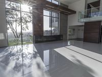 A modern and sunny room in Los Angeles, California. The spacious interior features large white tile flooring and two sets of windows with wooden walls. Perfect for a contemporary home in the sunshine state.