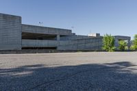 This stock photo showcases a modern architecture building in Toronto, Canada. The city building stands tall with its concrete walls and low line roof. In front of the building, there are a few bushes and some grass, adding a touch of greenery to the urban landscape. The clear sky and the shadow cast on the road surface enhance the aesthetics of this architectural marvel. The building is located near an empty parking lot, indicating the availability of public space in this residential area. The asphalt road and the industrial surroundings add to the urban feel of the scene. This photo captures the essence of modern architecture and the bustling city of Toronto in Ontario, Canada.
