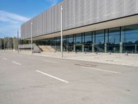 This stock photo features an empty lot with a building, bus stop, and traffic cones in the street nearby. The modern architecture of the office building is showcased against a clear sky with clouds. The composite material façade, shaded windows, and urban design blend seamlessly with the cityscape of Berlin. The concrete street and asphalt road add to the city life vibe of this vibrant European city.
