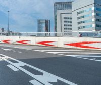 an intersection in a city with cars on the road and red painted arrows all over the pavement