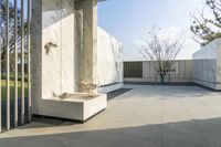 the courtyard features many concretes and greenery, including a concrete fountain and trees and trees around