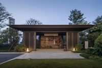 A modern residential villa in Foshan, China. The open space design blends seamlessly with the surrounding trees and greenery, creating a serene suburban oasis. The clear sky and artificial light highlight the architectural beauty of this Chinese home.