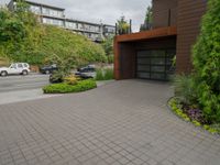 A modern villa surrounded by gloomy grey skies. The asphalt road leads to the property, with a vehicle parked on the road surface. The building showcases modern architecture against the cloudy backdrop.