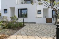 A modern residential villa in Shanghai, China. Clear sky highlights the clean lines of the white building and its straight down the road entrance. Windows and doors provide a glimpse of the interior. Surrounding vegetation adds to the suburban charm.