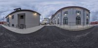 A monochromatic cityscape at dusk featuring classic architecture and a deserted street. The empty road leads to two buildings with a ramp, while the other half of the street showcases urban design and artificial light. A serene view of city life.