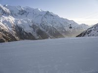A stunning view of the majestic Mont Blanc in the French Alps. Snow-capped peaks and glacial cliffs create a picturesque winter landscape. Clear skies and contrails add to the beauty. A popular tourist attraction for skiing and exploring the highlands of Europe.
