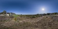 a 360 view of some hills with trees on each side of it and the sun in the sky above them