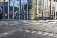 A snapshot of Montreal's business district at the break of day. The modern architecture of office buildings reflects off the asphalt roads. Shadows and hard shadows cast a unique urban design. Transport vehicles line the curbs, creating a bustling cityscape.