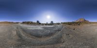 a view of a desert with the sun shining brightly on it, and on a clear day