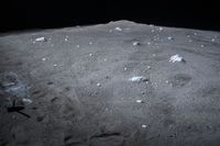 a view from a moon crater shows small pieces of dirt, ice and trash all around