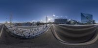 a photo of the sun shining through buildings in the city of moscow, russia, and a view of a half pipe on a parking lot of a city