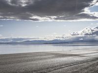 A lone motor cycle is parked on a beach at low tide waterside with mountains in the background. The image captures the stunning landscape of Utah's coastal region, with the clear blue ocean extending towards the horizon. The beach is lined with wet sand, creating a calm and serene atmosphere. The motorcycle stands as a symbol of adventure and exploration in this natural environment. The grey sky overhead adds a touch of drama to the scene, while the sunshine peeks through the clouds, illuminating the surroundings. This picturesque location is reminiscent of the famous Bonneville Speedway, known for its high-speed racing events. The image perfectly captures the beauty of Utah's highlands and the tranquility of its coastal plains.