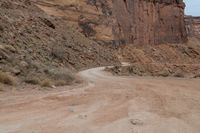 motorcycle rider jumping a hill on dirt road with rocks in background under cliff wall by roadway