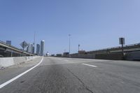 A person rides a motorcycle along an asphalt road in the city. A bridge with buildings can be seen in the background, creating a scenic cityscape. The clear sky above adds to the urban ambiance. The road surface is smooth and well-maintained, allowing for a comfortable ride. The motion blur effect adds a sense of speed and movement. This image captures the energy and vitality of city life with its bustling streets and towering skyscrapers.