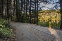 A man is riding his motorcycle down a gravel road beside a river in the woods of Ontario, Canada. The road surface is made of gravel and the surrounding area is covered with vegetation, including deciduous trees. The clear sky overhead provides ample sunlight, casting hard shadows on the ground. The dense forest and calm river create a peaceful and scenic landscape. The motorcyclist enjoys a leisurely ride, taking in the beauty of the larch trees and the reflection of the trees on the water.