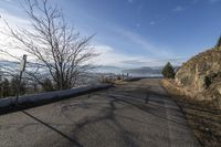 A scenic view of Kelowna, British Columbia, with its picturesque landscapes. The city skyline and skyscrapers are reflected in the calm waters of Okanagan Lake. The road winds through the valley, surrounded by lush greenery and towering mountains.