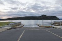 A rural landscape at dawn, with a straight road leading towards mountains. Asphalt road surface bordered by fences. Clouds hovering over a coastal lake, creating a serene and scenic view.