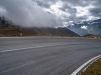 A dramatic landscape in the highlands of Austria. The curving asphalt road cuts through the mountainous terrain, with cumulus clouds adding to the dramatic backdrop. A perfect day for a scenic drive in rural Europe.